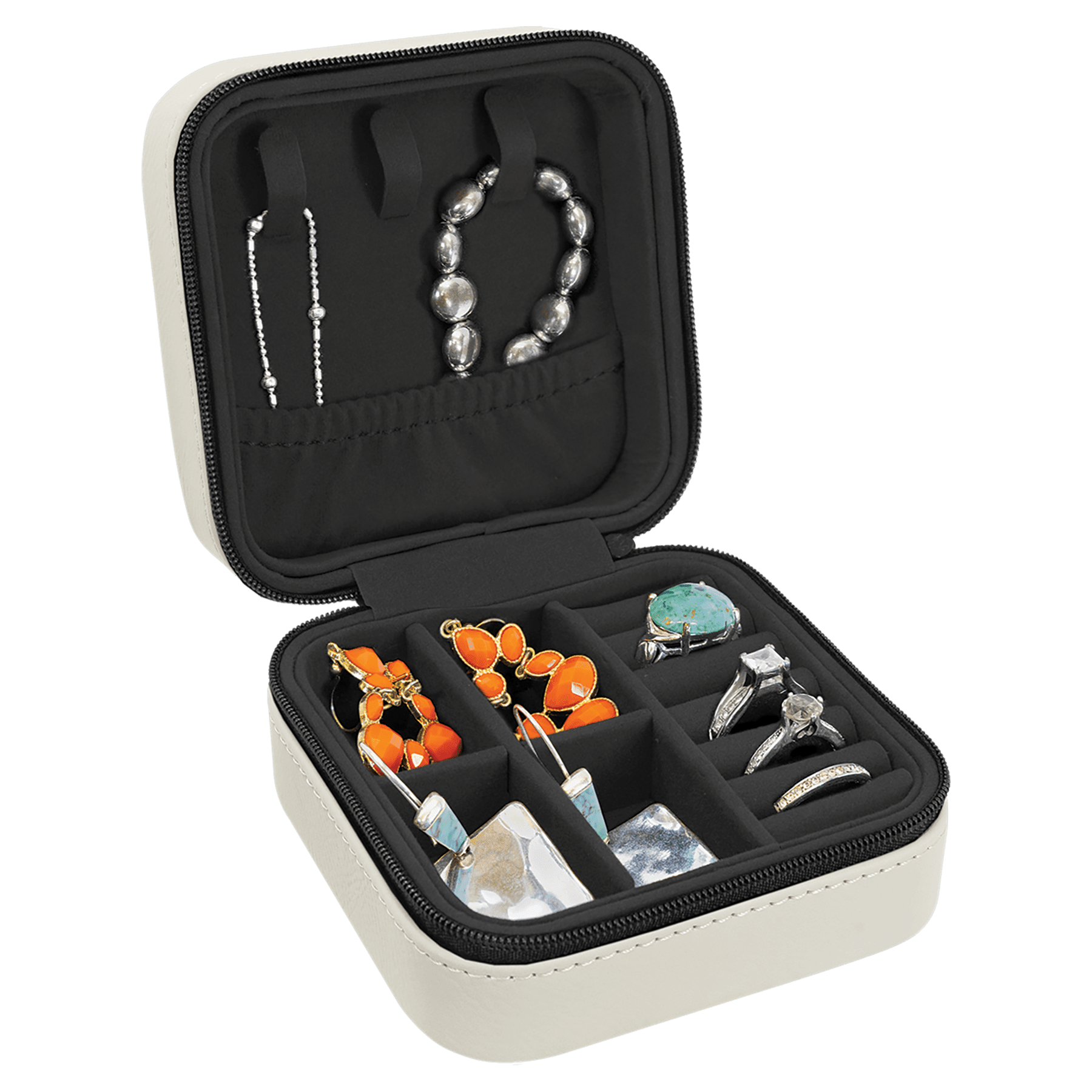 This 4" x 4" laserable leatherette travel jewelry box is custom engraved in-house by Bourbon Mountain and designed for compact, secure jewelry storage while traveling or at home. Its small footprint makes it easy to pack in a suitcase, purse, or bag, while still offering organized storage for everyday jewelry.