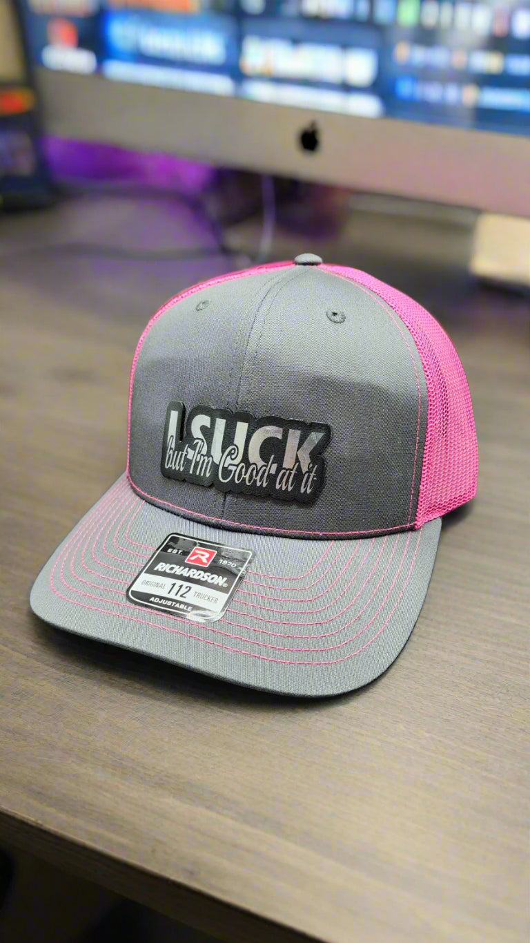 The Richardson 112 I suck But... cap features a durable stainless steel to black acrylic patch, adding a stylish touch to your attire. Handwashing is recommended for maintenance. Stand out with the sleek charcoal and neon pink hat. Designed with the humorous and slightly unskilled gamer in mind.